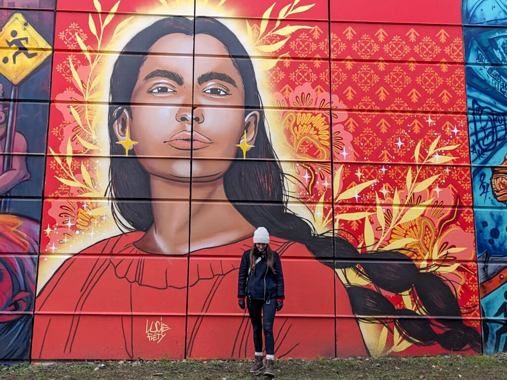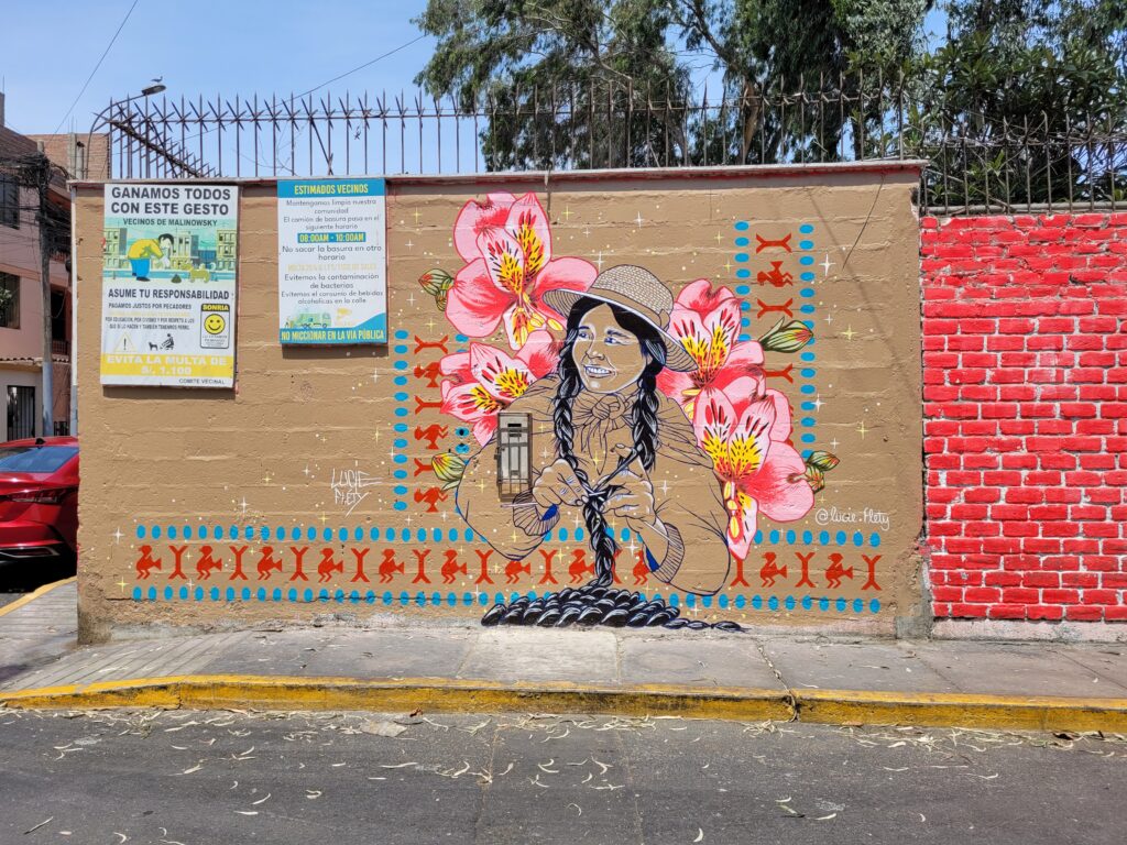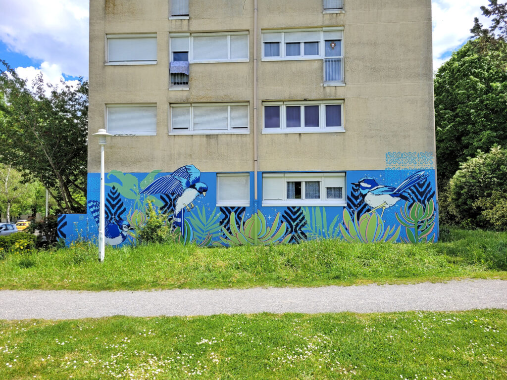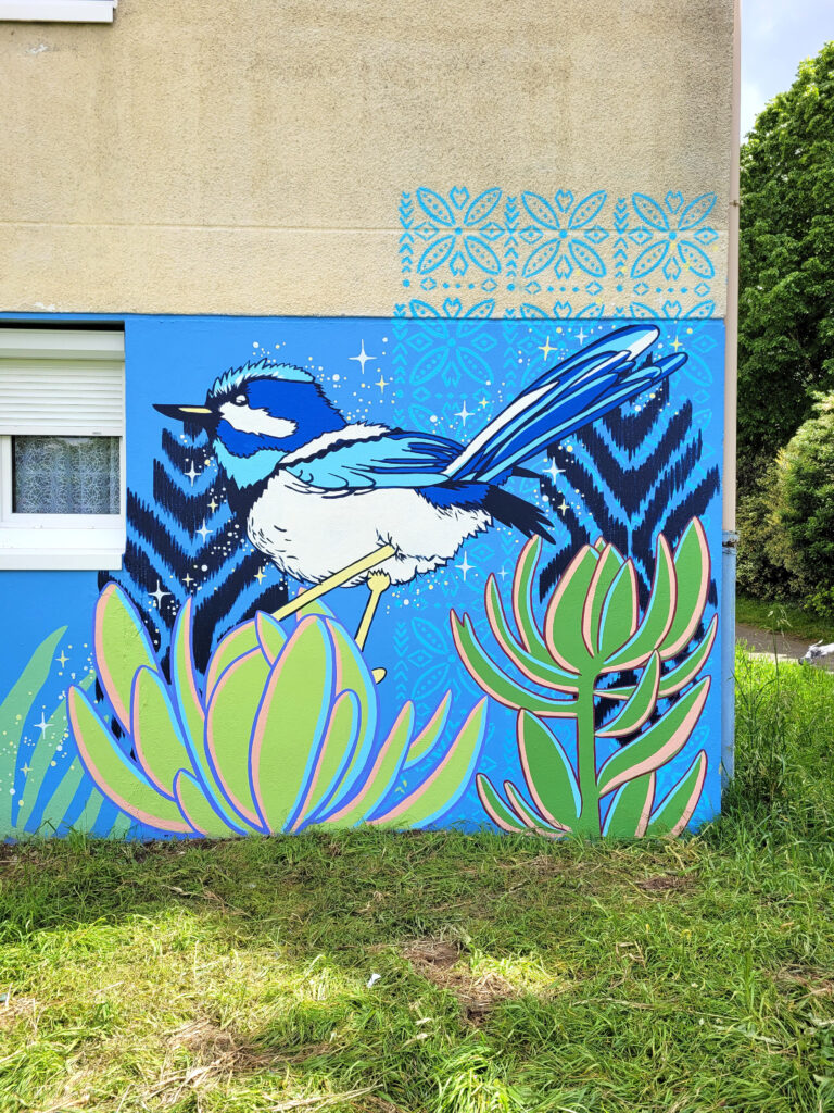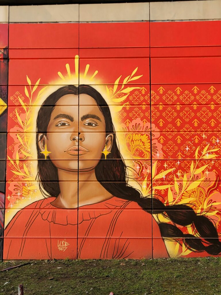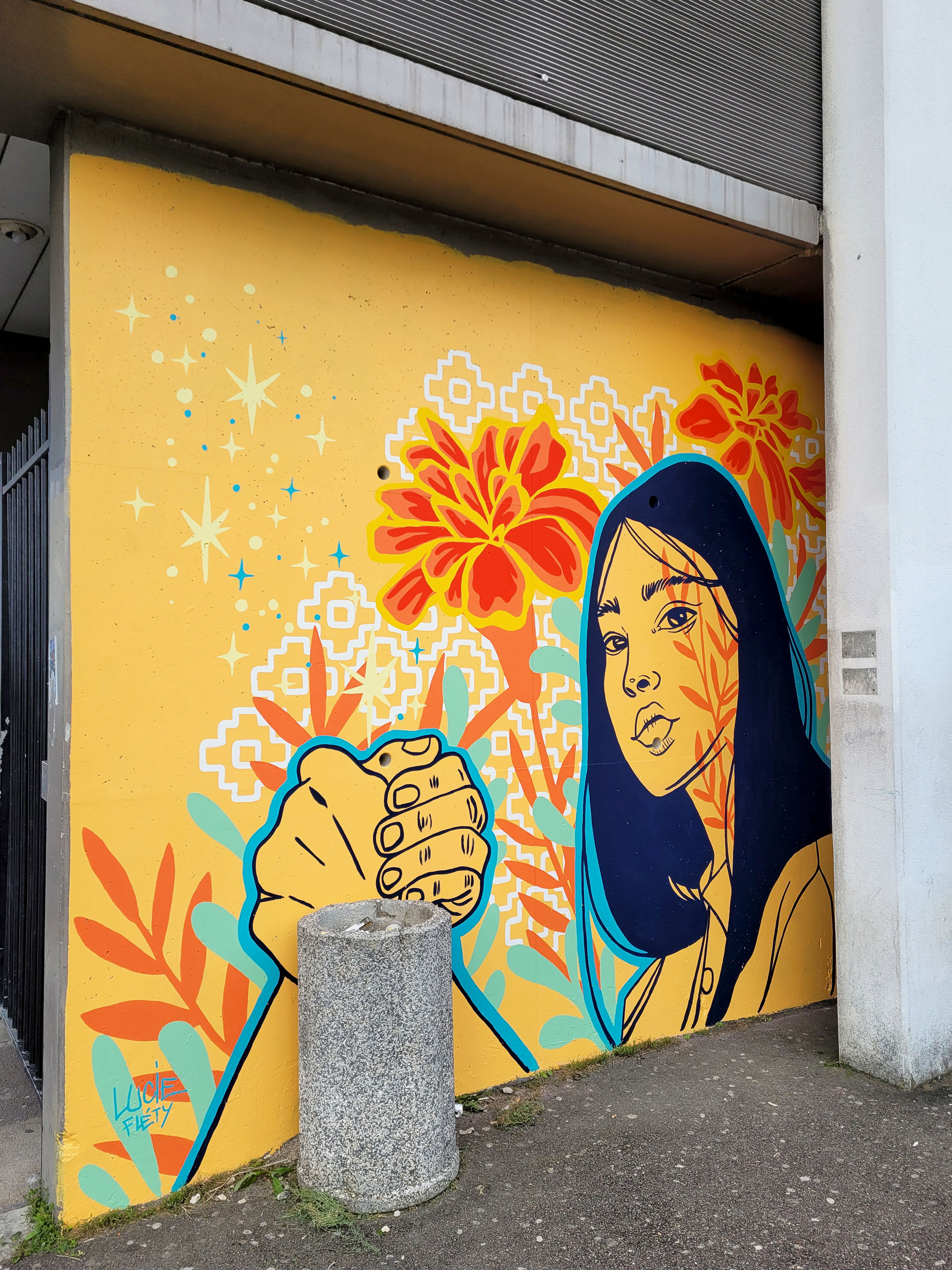 Les motifs de fond et les fleurs s’inspirent de tissus artisanaux et questionnent le lien du personnage à ses traditions, son histoire et ses racines. Allégorie de la résilience, cette femme-phénix semble avoir triomphé de ses propres obstacles par le feu sacré. Ce mur donne forme aux luttes féministes et montre la capacité des femmes à sublimer leurs combats.