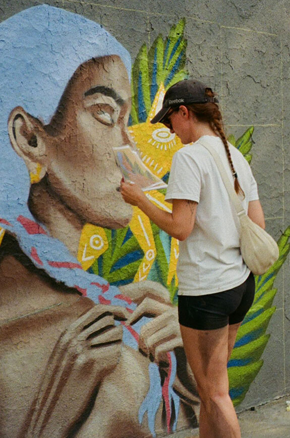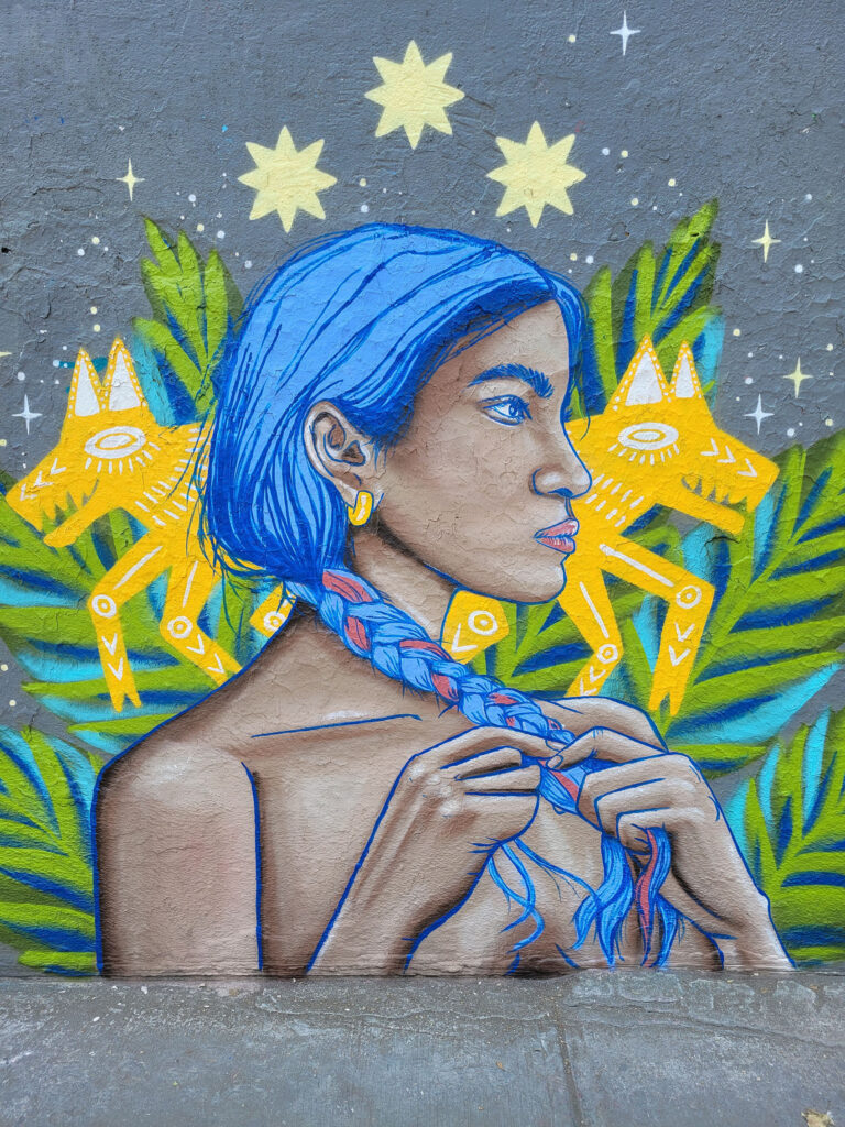 Ce deuxième portrait réalisé à Spot 13 aborde la thématique de la puissance féminine dans une interprétation du réalisme magique. Une aura se dégage de la figure féminine qui s’impose en divinité païenne et défie le spectateur avec assurance. Le motif de la tresse rappelle l’idée de solidarité, l’union de différentes forces mais aussi les traditions de tissages artisanaux ainsi que l’idée de tisser les fils de son propre avenir.