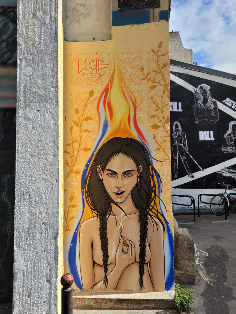 Sur ce mur, une femme tenant une allumette prend feu et semble s’adresser au spectateur avec un regard inquiétant, reflétant les flammes qui l’embrasent. Entre la colère, la jouissance ou la revanche, sa force mystérieuse défie les passants et les invite à se questionner sur la raison de son acte. Entourée de ronces et d’épines dorées, elle dégage un sillon d’étoiles qui transcende son combat et sa colère et semble sublimer sa violence, sa folie.