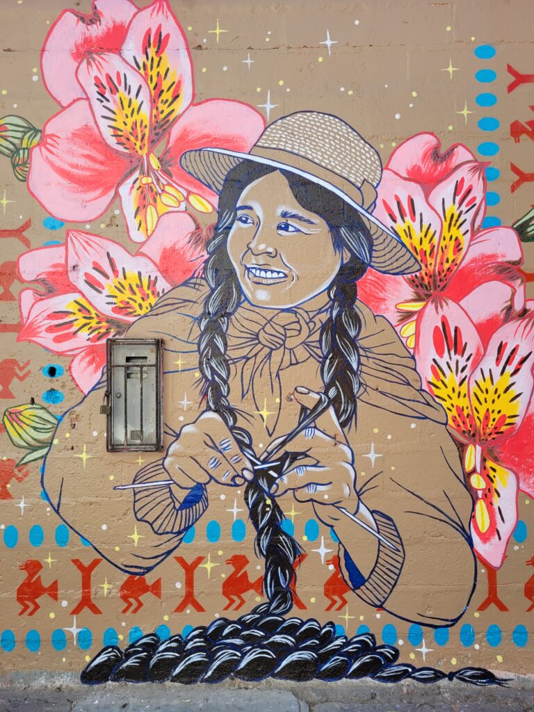 Ce portrait est inspiré d’une femme de la communauté des Uros, au lac Titicaca. Elle tisse ses tresses en une longue tresse commune. Sa longueur évoque les années de collaboration et de solidarité féminine, mais aussi les années de transmission d’une génération à une autre de femmes.