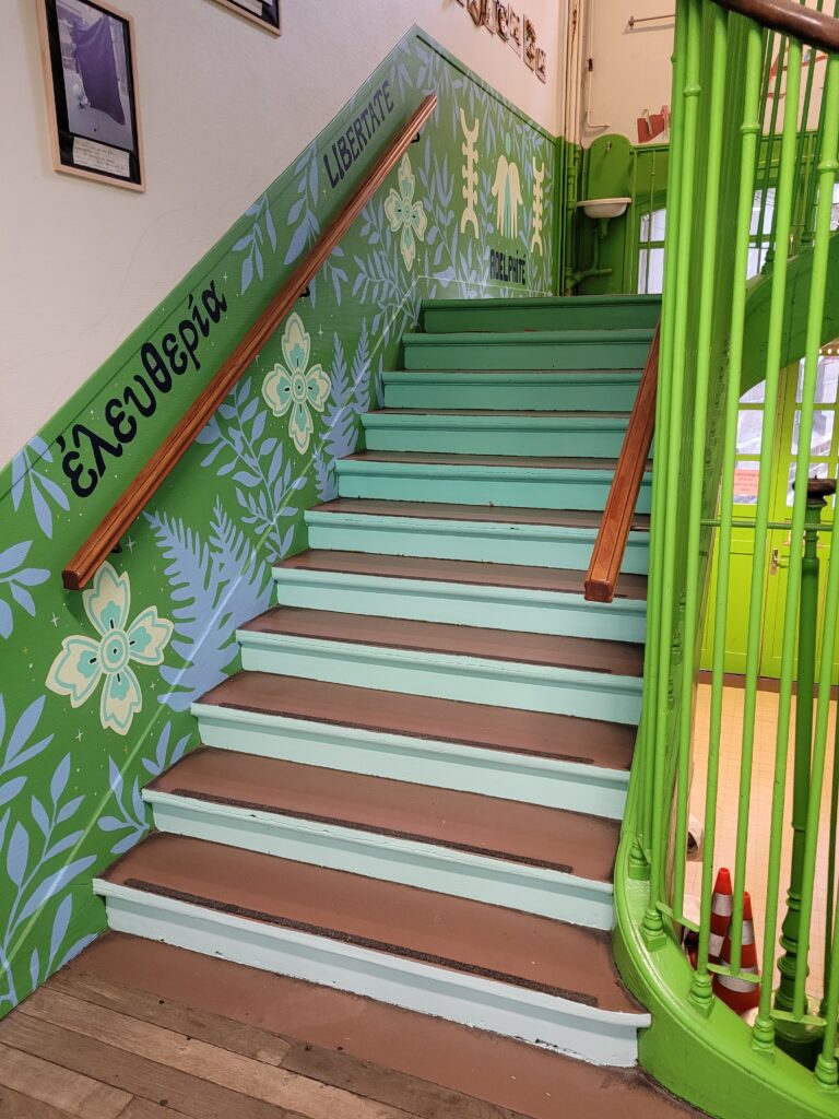 Deux classes de CM1 et des élèves UPE2A ont pu participer à la réalisation d’une fresque dans les escaliers de leur école, à mes côtés. Nous avons dans un premier temps découvert le musée du Quai Branly et le musée de street-art à ciel ouvert Spot 13 pour chercher des inspirations pour notre projet sur le thème du bien vivre ensemble et du multiculturalisme. Après s’être initiés au pochoirs et avoir découvert le monde du street-art nous avons peint les escaliers et leurs marches lors de 6 ateliers de 2H.