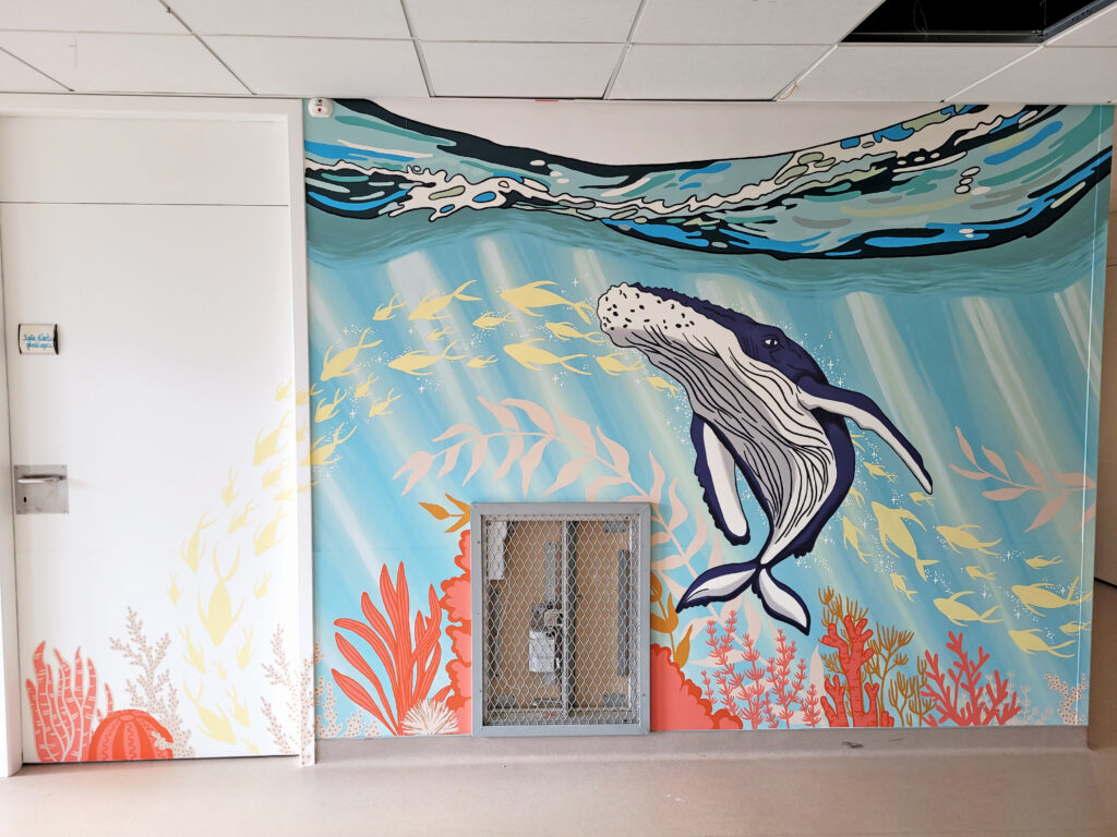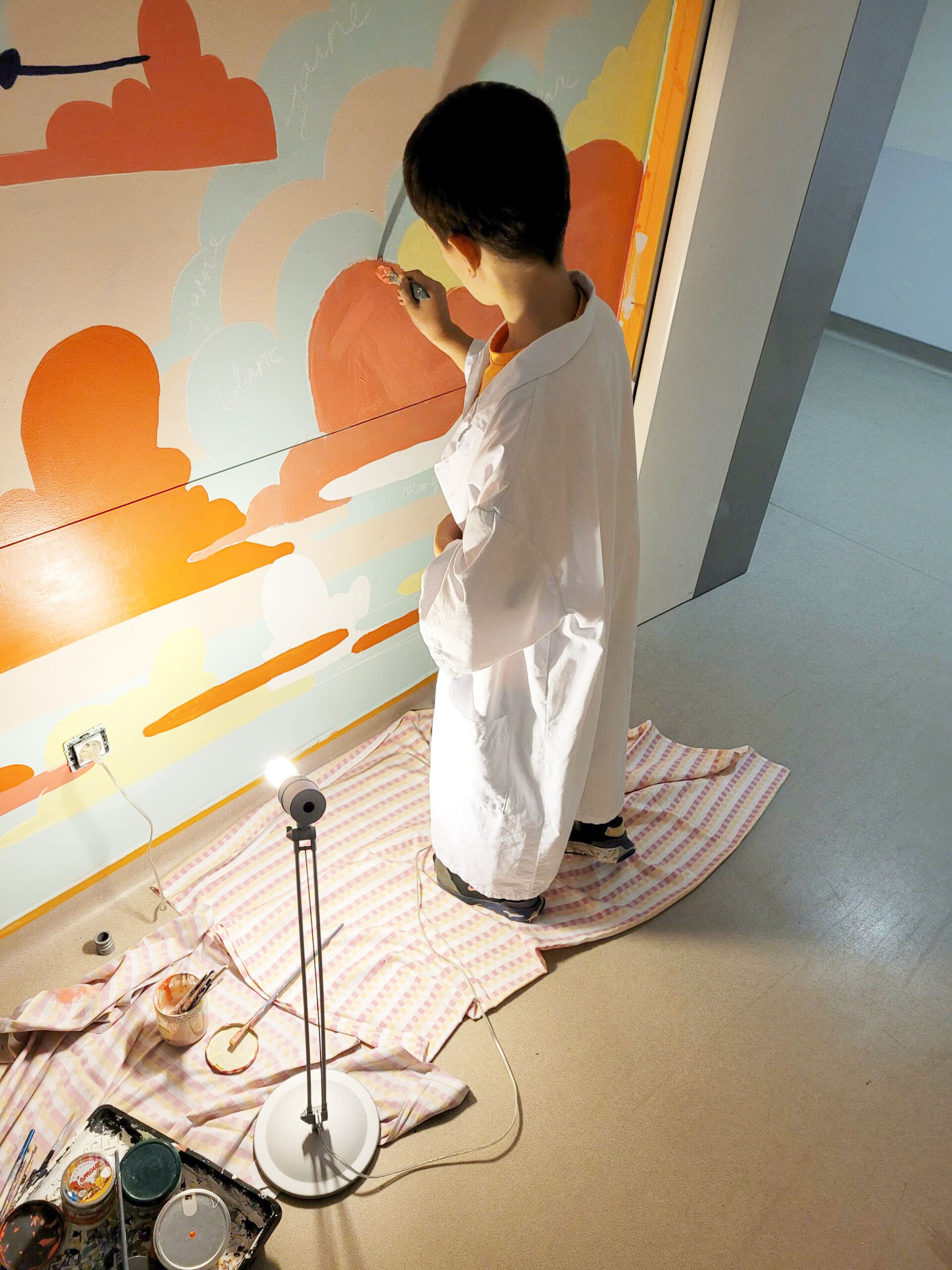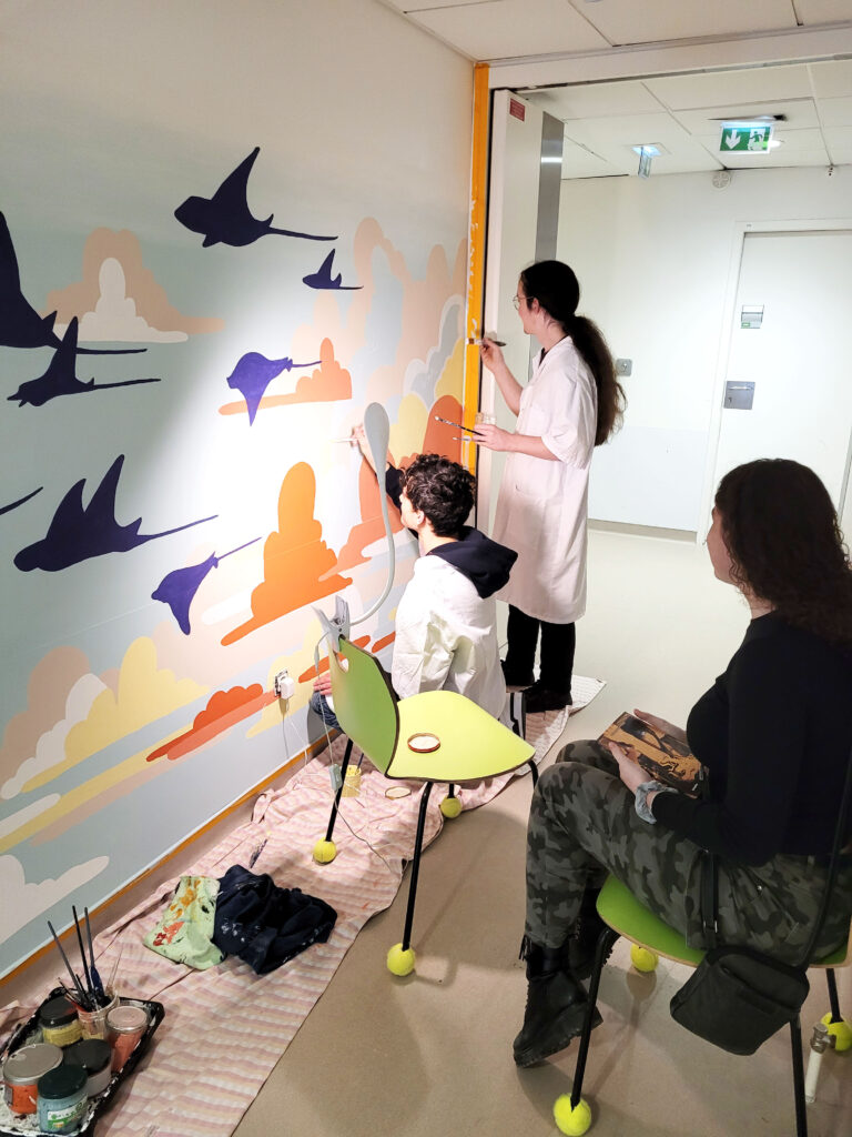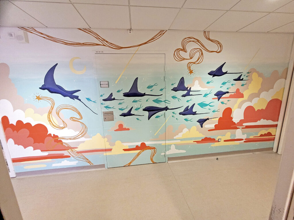 Fin 2023, j’ai réalisé 5 fresques sur les murs de l’unité de soins intensifs de pédopsychiatrie de l’hôpital Guillaume Régnier, à Rennes.