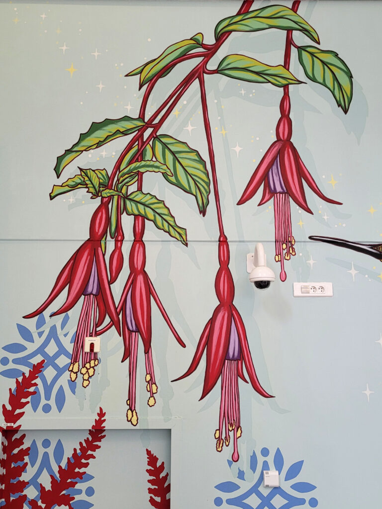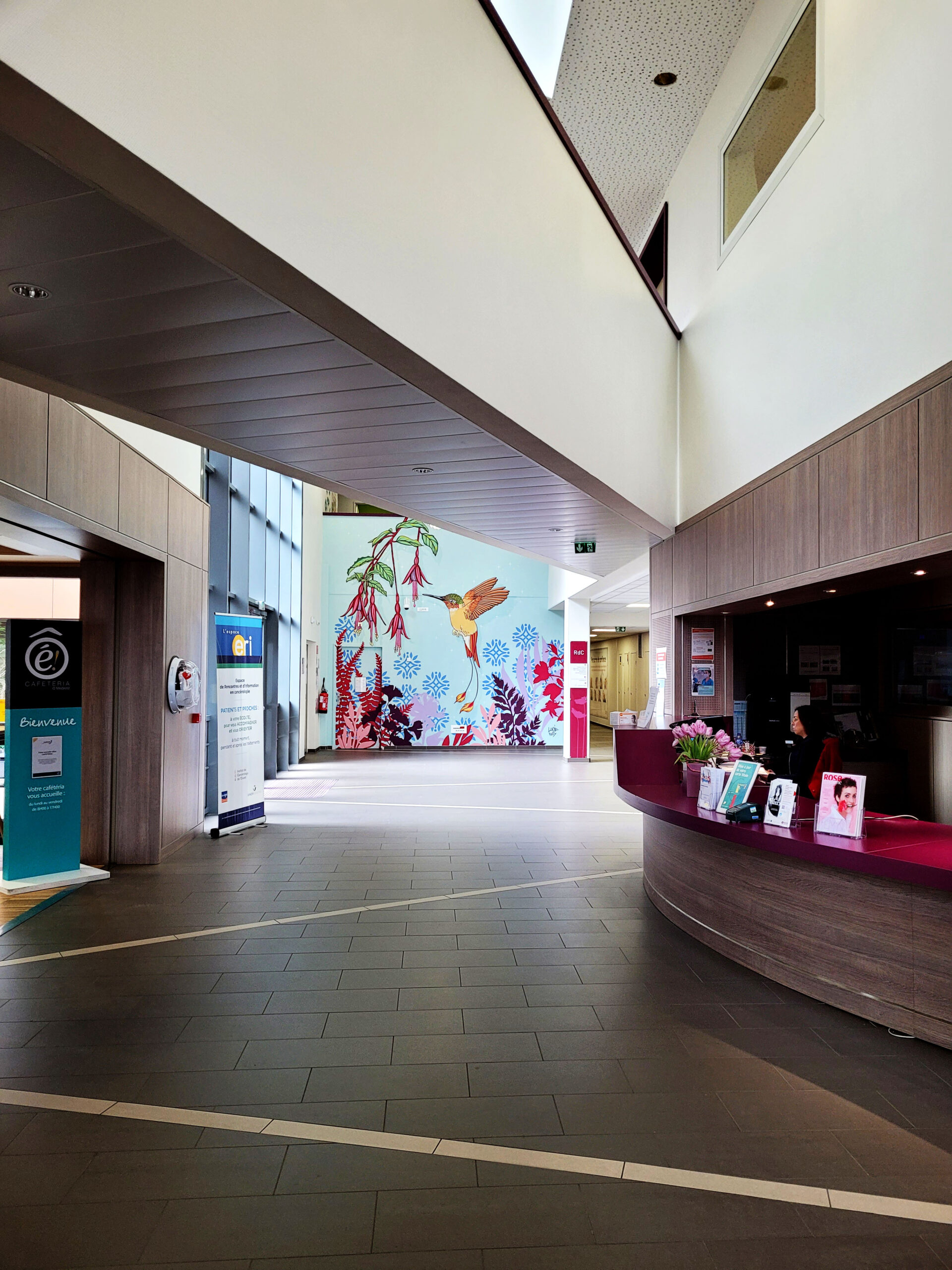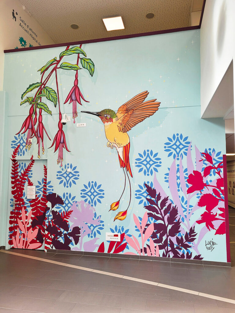 Dans le cadre du projet Art sur les murs, cette œuvre a été créée avec la participation des patients, soignants et aidants, pour apporter une touche de douceur au parcours de soin et initier chacun à l’art. Cette réalisation onirique a pour but d’accompagner les patients dans leur lutte contre le cancer. Un colibri, symbole de joie de vivre et de guérison, y prend son envol avec des allures de phénix et accueille les visiteurs dès leur entrée dans l’établissement. Le fuchsia, quant à lui, est un symbole de force et de résilience, tandis que les fougères représentent la renaissance.