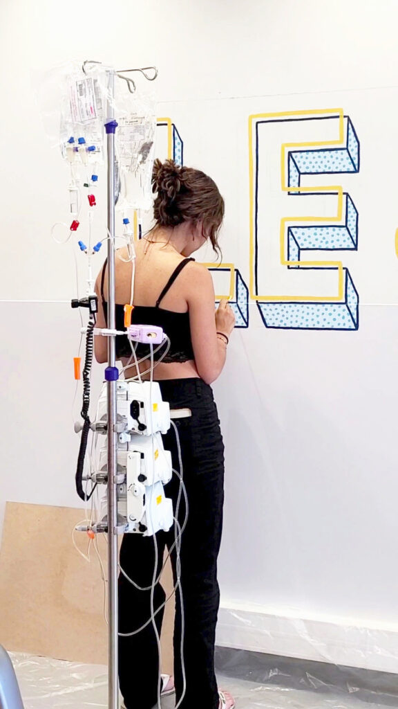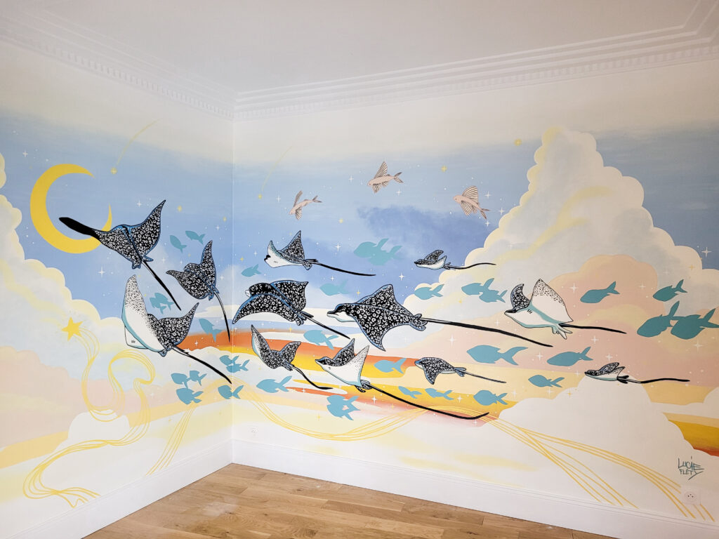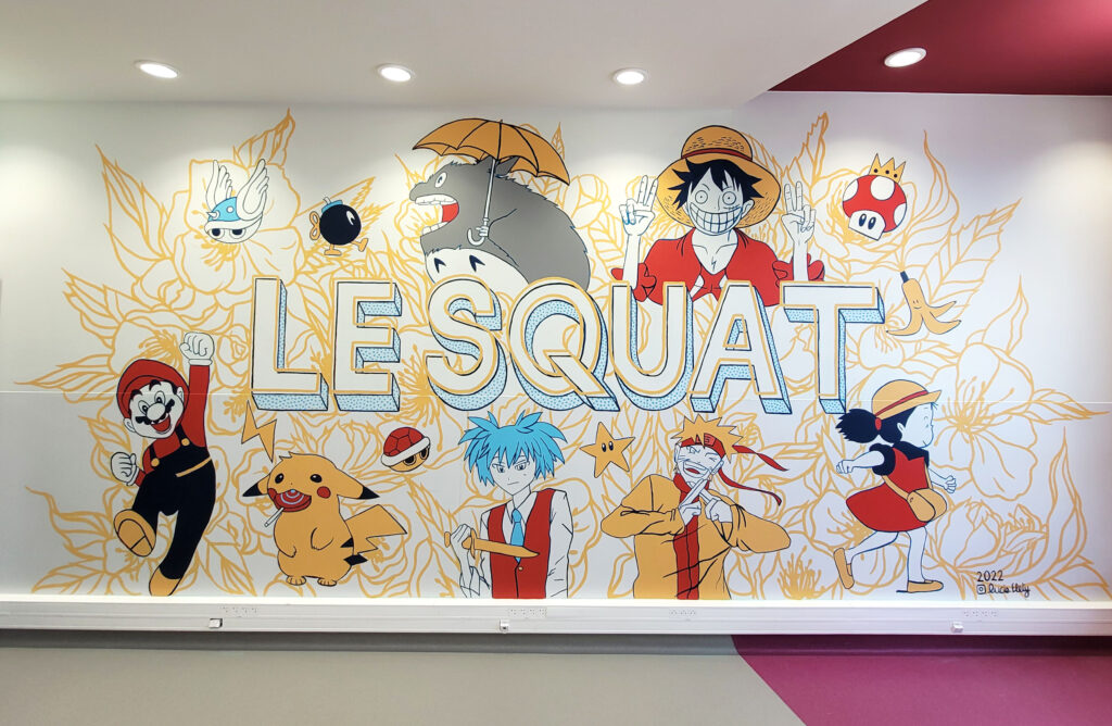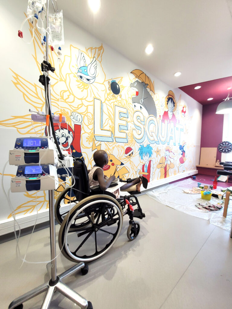 J’ai été commissionnée par l’Institut Gustave Roussy, premier pôle européen de lutte contre le cancer, pour réaliser une fresque afin d’habiller la salle de loisirs des jeunes de l’unité de cancérologie pédiatrique. Après avoir rencontré différents jeunes pour mieux connaître leurs centres d’intérêt, la thématique des mangas s’est imposée naturellement. Je me suis inspirée de leurs personnages préférés pour les rassembler dans une grande composition. Nous avons réalisé la fresque tous ensemble sur près d’une semaine.